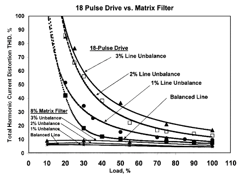Table 3 Conclusion Drives are applied in heating, ventilating, and air conditioning applications because loads are variable and users demand energy efficiency and comfort. Varying loads result in load unbalances within building power distribution systems which add to the utility line voltage unbalance at the point of common coupling. Harmonic mitigation techniques which are not effective with line voltage unbalances of 1% to 3% at the point of utilization will not as a practical matter achieve useful results. The data in this report show that a standard six-pulse drive fed from a low pass Matrix Filter provides superior harmonic performance to an eighteen-pulse drive in applications with variable loads and line voltage unbalances ranging from 0% to 3%.
